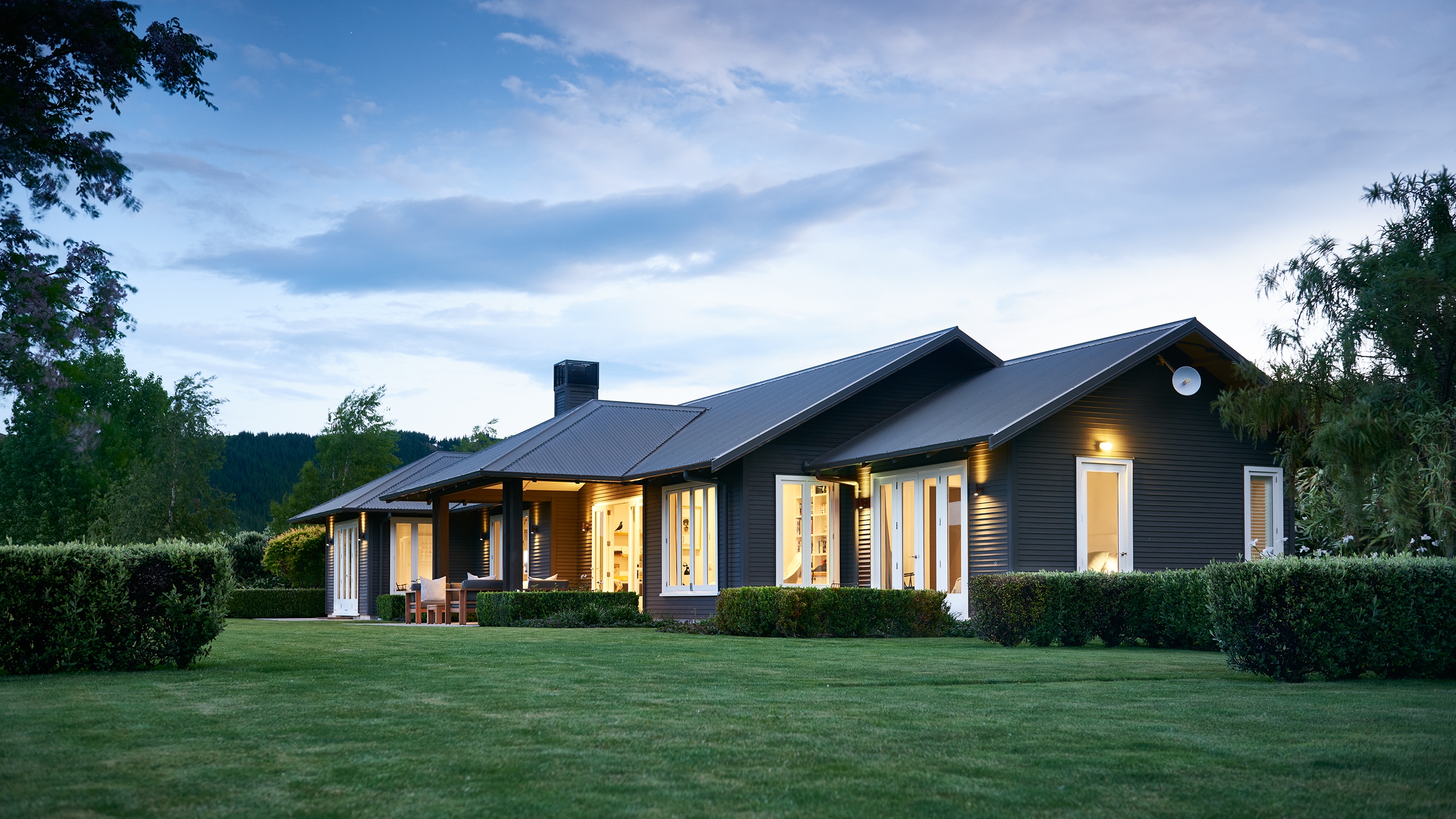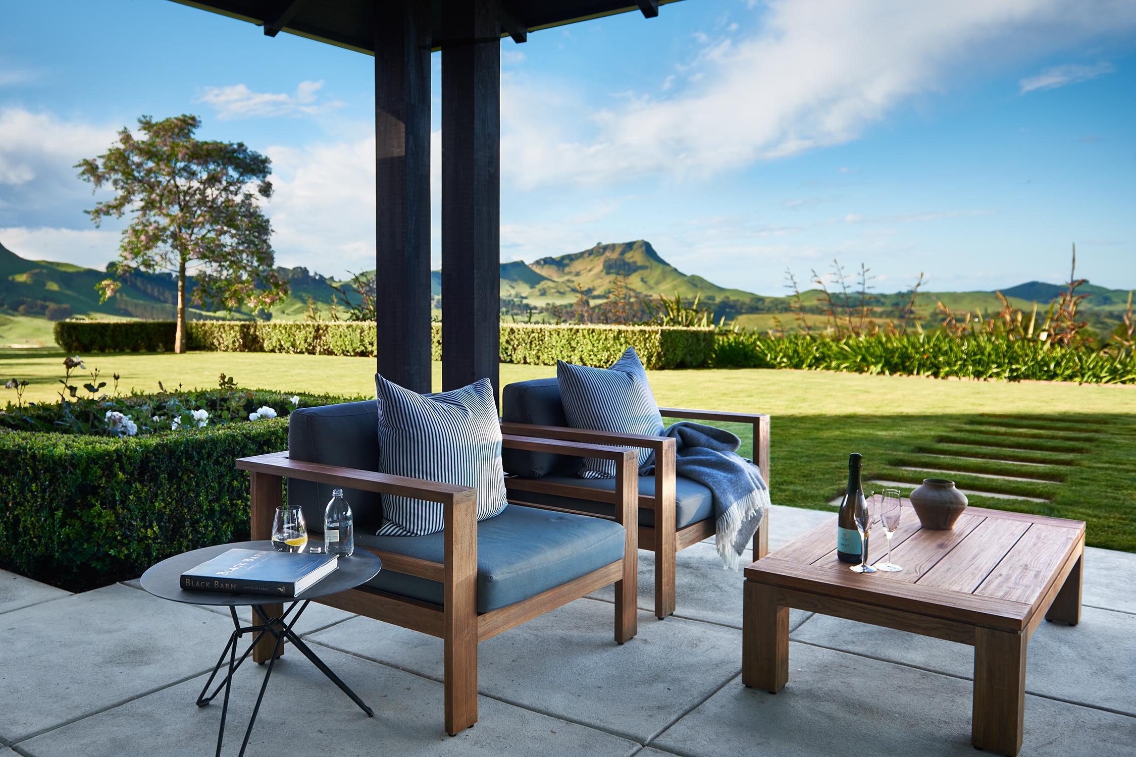 There is a large flat lawn perfect for lawn games and expansive views of the Tukituki Valley and Te Mata Peak. It is a short walk down to the communal tennis court at Poplars Upstream.